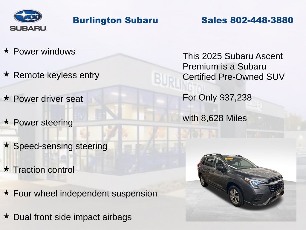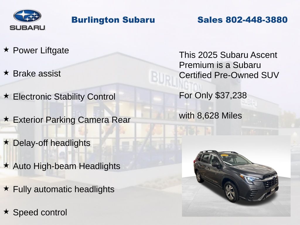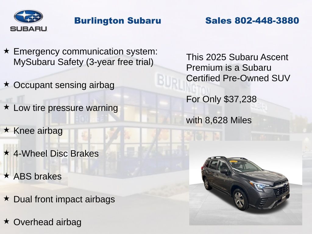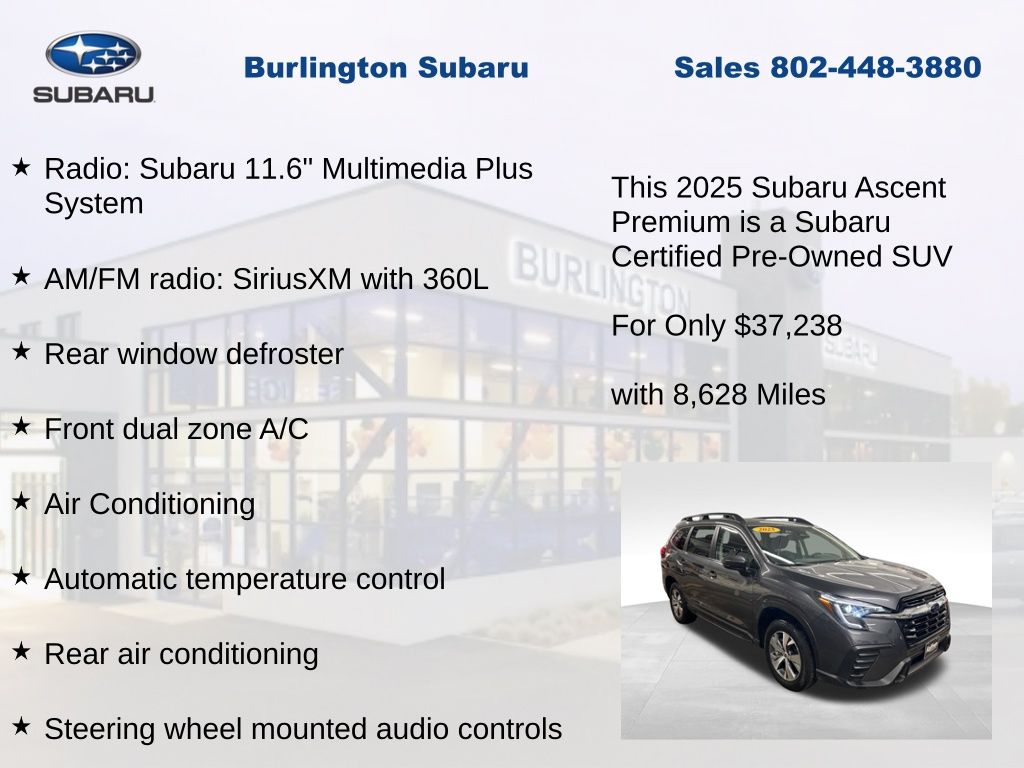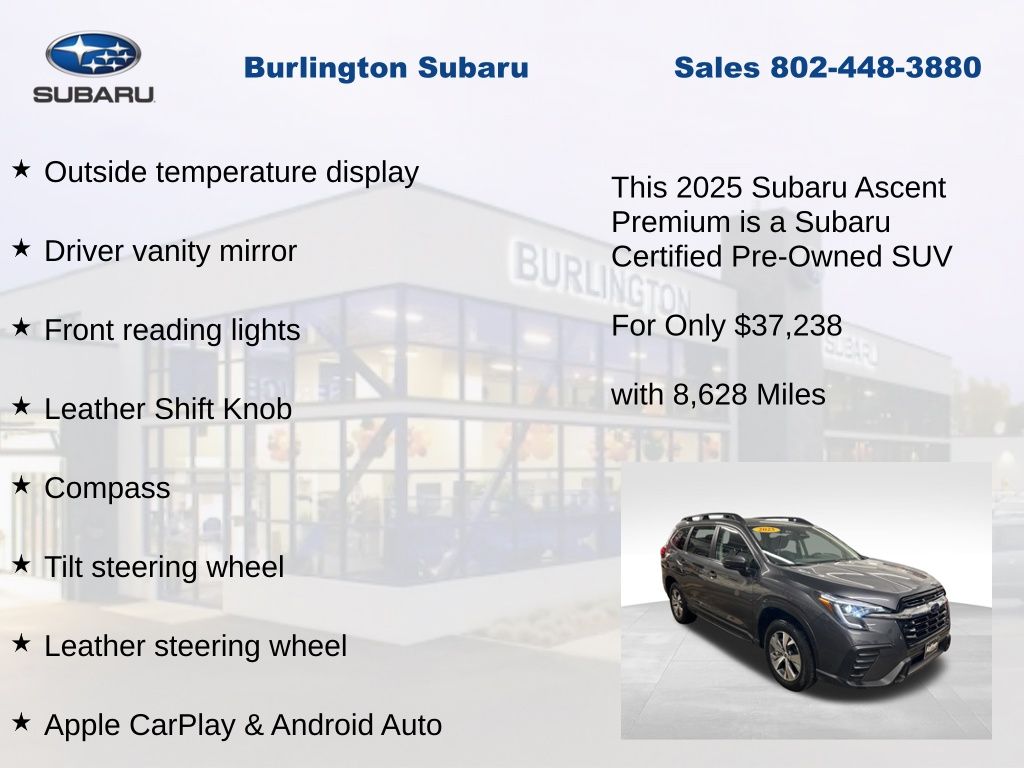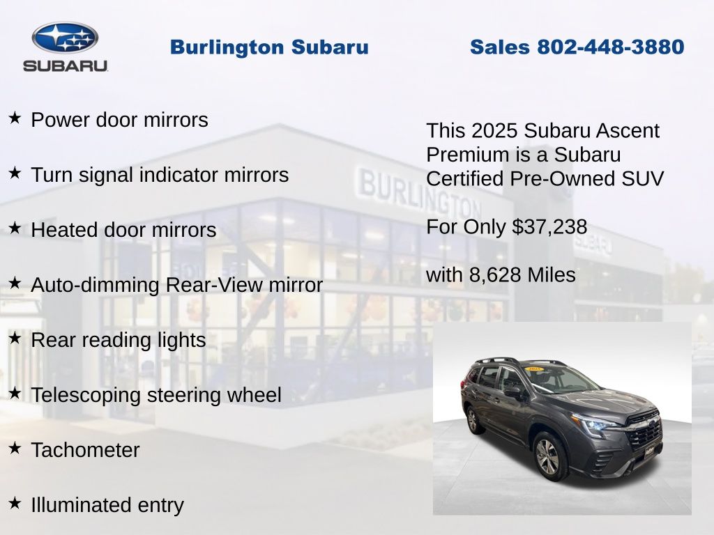 CARFAX One-Owner. Clean CARFAX. Subaru Ascent Premium 2025 Certified. 4-Wheel Disc Brakes, ABS brakes, Air Conditioning, Alloy wheels, AM/FM radio: SiriusXM with 360L, Apple CarPlay & Android Auto, Auto High-beam Headlights, Auto-dimming Rear-View mirror, Automatic temperature control, Brake assist, Compass, Delay-off headlights, Driver vanity mirror, Dual front impact airbags, Dual front side impact airbags, Electronic Stability Control, Emergency communication system: MySubaru Safety (3-year free trial), Exterior Parking Camera Rear, Four wheel independent suspension, Front dual zone A/C, Front reading lights, Fully automatic headlights, Heated door mirrors, Heated Front Bucket Seats, Illuminated entry, Knee airbag, Leather Shift Knob, Leather steering wheel, Low tire pressure warning, Occupant sensing airbag, Outside temperature display, Overhead airbag, Passenger vanity mirror, Power door mirrors, Power driver seat, Power Liftgate, Power steering, Power windows, Radio: Subaru 11.6" Multimedia Plus System, Rear air conditioning, Rear reading lights, Rear window defroster, Rear window wiper, Reclining 3rd row seat, Remote keyless entry, Speed control, Speed-sensing steering, Split folding rear seat, Steering wheel mounted audio controls, Tachometer, Telescoping steering wheel, Tilt steering wheel, Traction control, Trip computer, Turn signal indicator mirrors, Variably intermittent wipers. Odometer is 1719 miles below market average!
