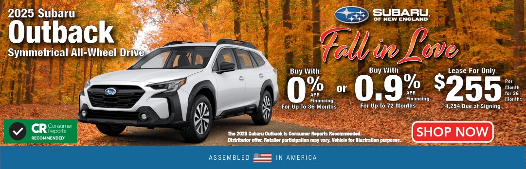 Subaru Manufacturer Specials. 0% APR Financing for up to 36 months available on a new 2025 Subaru Outback through Subaru Motors Finance for well-qualified applicants only. 36 monthly payments of $30.76 for each $1,000 financed. No down payment required. Offer may vary by location. Other rates and payment terms available. Offers available through Subaru Motors Finance for well-qualified applicants only. Subject to credit approval, vehicle insurance approval, and vehicle availability. No down payment required. MSRP does not include tax, title, and registration fees. MSRP subject to change and may not apply to all vehicles in retailer inventory. Retailer price may vary. Tax, title, license and registration fees due at signing. Prices, specifications, options, features, and models subject to change without notice. Cannot be combined with any other incentive. Local availability and retailer participation may vary. See participating retailer for complete details. Vehicles for illustration purposes only. Offer ends 12/1/25.