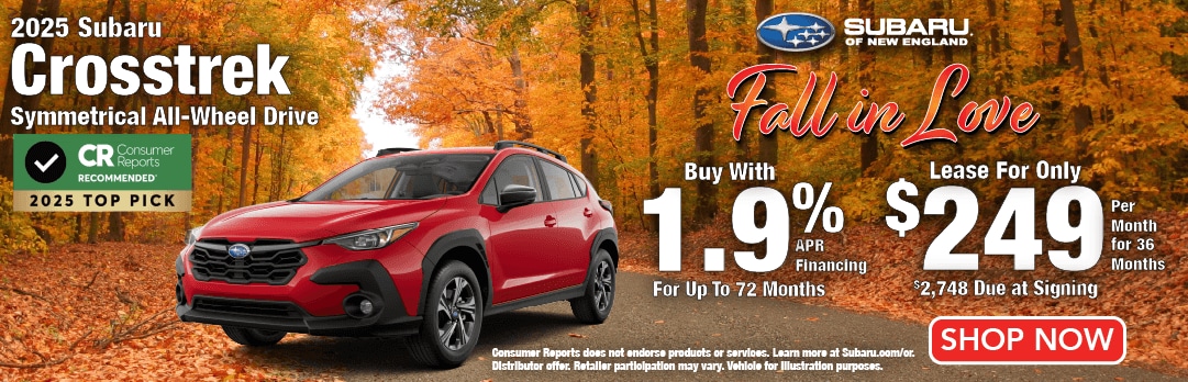 Subaru Manufacturer Special. 1.9% APR Financing for up to 72 months available on new 2025 Subaru Crosstrek models available through Subaru Motors Finance for well-qualified applicants only. 72 monthly payments of $14.71 for each $1,000 financed. Subject to credit approval, vehicle insurance approval, and vehicle availability. Other incentive rates available. No down payment required. Retailer price may vary. MSRP does not include tax, title, and registration fees. MSRP subject to change and may not apply to all vehicles in retailer inventory. Tax, title, license and registration fees due at signing. Prices, specifications, options, features, and models subject to change without notice. Cannot be combined with any other incentive. Local availability and retailer participation may vary. See participating retailer for complete details. Vehicles for illustration purposes only. Offer ends 12/1/25.