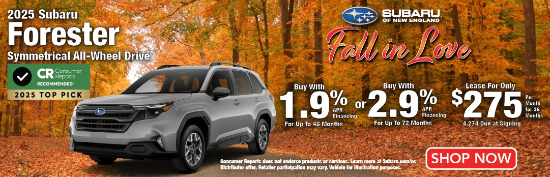 Subaru Manufacturer Specials. 1.9% APR Financing for up to 48 months available on a new 2025 Subaru Forester (Model codes SFB, SFD, SFF, SFH, SFJ, SFL) through Subaru Motors Finance for well-qualified applicants only. 48 monthly payments of $21.65 for each $1,000 financed. Subject to credit approval, vehicle insurance approval, and vehicle availability. MSRP does not include tax, title, and registration fees. MSRP subject to change and may not apply to all vehicles in retailer inventory. No down payment required. Retailer price may vary. Tax, title, license and registration fees due at signing. Prices, specifications, options, features, and models subject to change without notice. Cannot be combined with any other incentive. Local availability and retailer participation may vary. See participating retailer for complete details. Vehicles for illustration purposes only. Offer ends 12/1/25.