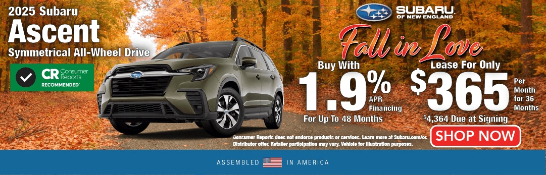 Subaru Manufacturer Specials. 1.9% APR Financing for up to 48 months available on a new 2025 Subaru Ascent through Subaru Motors Finance for well-qualified applicants only. 48 monthly payments of $21.65 for each $1,000 financed. Subject to credit approval, vehicle insurance approval, and vehicle availability. No down payment required. MSRP does not include tax, title, and registration fees. MSRP subject to change and may not apply to all vehicles in retailer inventory. Retailer price may vary. Tax, title, license and registration fees due at signing. Prices, specifications, options, features, and models subject to change without notice. Cannot be combined with any other incentive. Local availability and retailer participation may vary. See participating retailer for complete details. Vehicles for illustration purposes only. Offer ends 12/1/25.