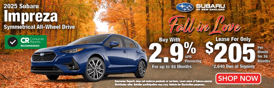 Subaru Manufacturer Specials. 2.9% APR Financing for up to 48 months available on a new 2025 Subaru Impreza through Subaru Motors Finance for well-qualified applicants only. 48 monthly payments of $22.09 for each $1,000 financed. Subject to credit approval, vehicle insurance approval, and vehicle availability. No down payment required. MSRP does not include tax, title, and registration fees. MSRP subject to change and may not apply to all vehicles in retailer inventory. Retailer price may vary. Tax, title, license and registration fees due at signing. Prices, specifications, options, features, and models subject to change without notice. Cannot be combined with any other incentive. Local availability and retailer participation may vary. See participating retailer for complete details. Vehicles for illustration purposes only. Offer ends 12/1/25.